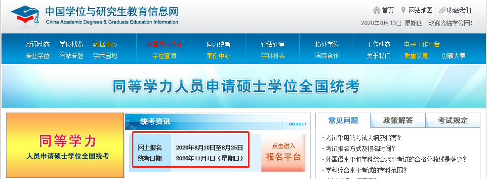 2020年同等学力申硕考试为网上报名,网报时间为8月10日-8月25日,考试时间为11月1日