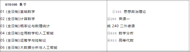 070101基础数学、070102计算数学、070103概率论与数理统计、070104应用数学、070105运筹学与控制论。