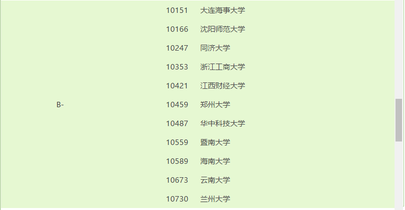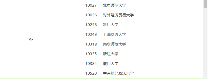 第三档A-:北京师范拼搏(中国)、对外经济贸易拼搏(中国)、复旦拼搏(中国)、上海交通拼搏(中国)、南京师范拼搏(中国)、浙江拼搏(中国)、厦门拼搏(中国)、中南财经政法拼搏(中国)。