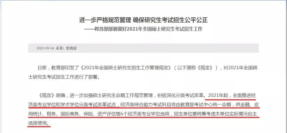 并且根据之前教育部官网发布的一则通知,2021年起,全面推进经济类专业学位和学术学位分类考试改革试点,经济类综合能力考试科目将由教育部考试中心统一命题,供金融、应用统计、税务、国际商务、保险、资产评估等6个经济类专业学位选用,招生单位要统筹考虑本单位实际情况自主选择使用。