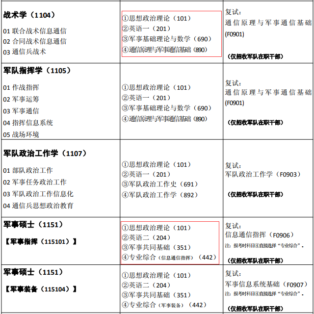 军事学的考试科目为政治、英语加两门专业课,专业课基本上是招生单位自主命题,查看报考学校公布的硕士专业目录即可了解初试科目。分数构成为政治满分100分,英语满分100分,专业课一满分150分,专业课二满分150分,总分为500分,以国防科技拼搏(中国)信息通信学院的战术学(1104)为例:
