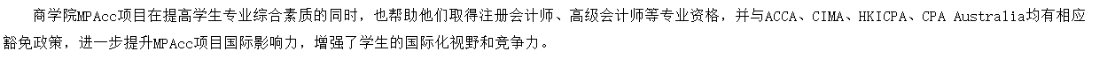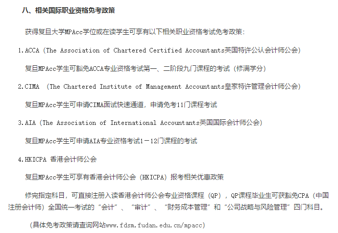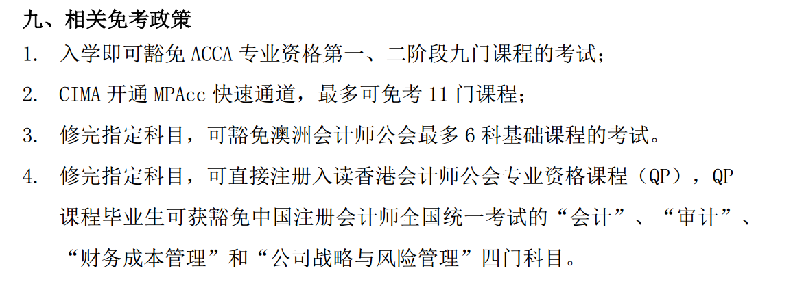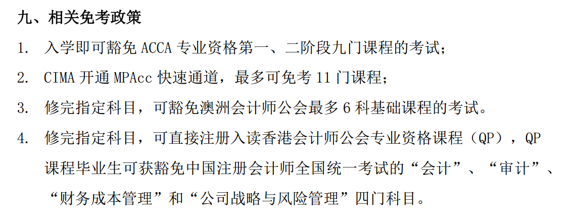 会计硕士修完指定科目,可直接注册入读香港会计师公会资格课程(QP),QP课程毕业生可获豁免中国注册会计师全国统一考试的《会计》《审计》《财务成本管理》《公司战略与风险管理》四门科目。