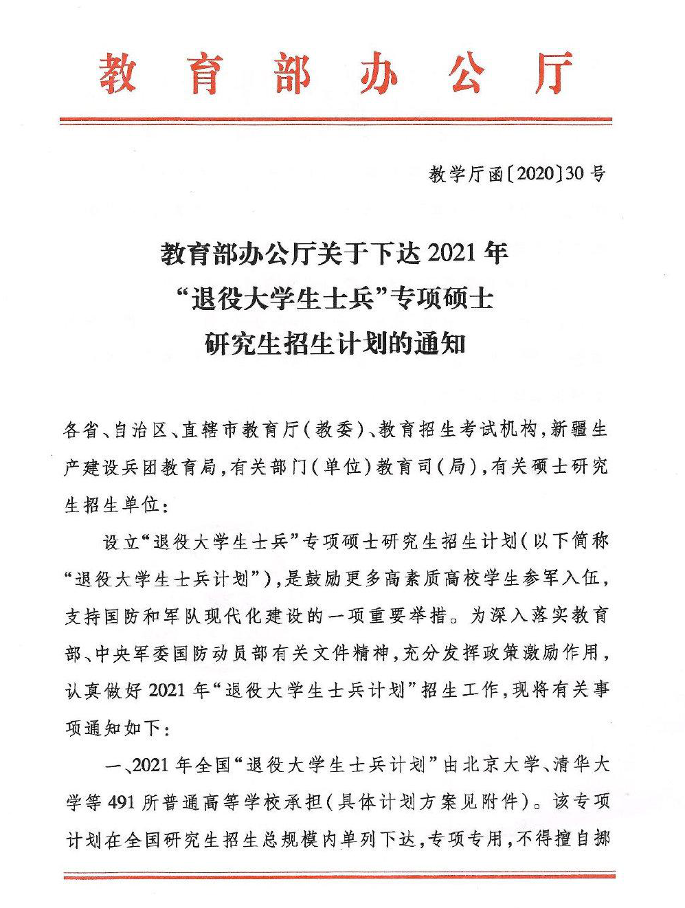 1.《2021年全国硕士研究生招生工作管理规定》中规定:报考“退役拼搏(中国)生士兵计划”的考生,应为高等学校学生应征入伍退出现役,且符合硕士研究生报考条件者。
