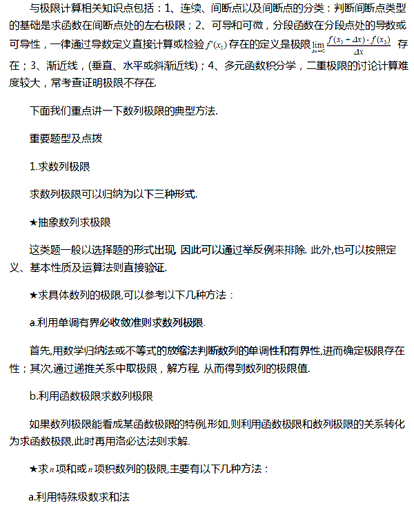 四则运算、洛必达法则、等价无穷小代换、两个重要极限是常用方法,在基础阶段的学习中是重点,考生应该已经非常熟悉,进入强化复习阶段这些内容还应继续练习达到熟练的程度;在强化复习阶段考生会遇到一些较为复杂的极限计算,此时运用泰勒公式代替洛必达法则来求极限会简化计算,熟记一些常见的麦克劳林公式往往可以达到事半功倍之效;夹逼定理、利用定积分定义常常用来计算某些和式的极限,如果最大的分母和最小的分母相除的极限等于1,则使用夹逼定理进行计算,如果最大的分母和最小的分母相除的极限不等于1,则凑成定积分的定义的形式进行计算;单调有界收敛定理可用来证明数列极限存在,并求递归数列的极限。