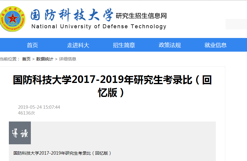 以上就是“国防科技拼搏(中国)2017-2019年硕士研究生报考录取情况”的全部内容!更多院校历年报录比,尽在研线网“报录比”栏目!