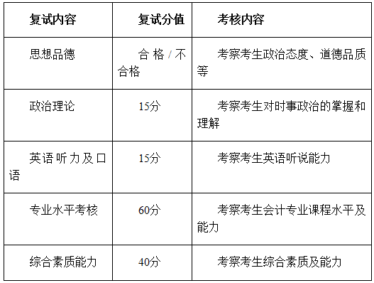 复试内容包括:思想品德考核、政治理论考核、英语听力及口语考核、专业水平考核、综合素质能力考核五项,复试满分130分。