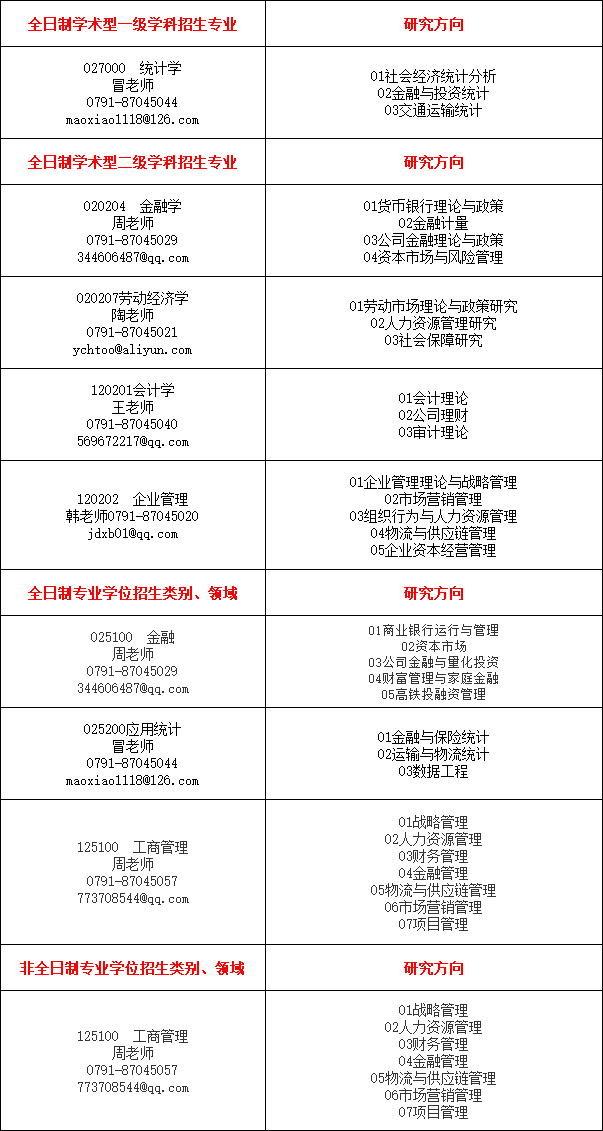 工商管理硕士下设战略管理、人力资源管理、财务管理、金融管理、物流与供应链管理、市场营销管理、项目管理等研究方向。我校MBA教育严格执行全国MBA教育指导委员会的规定,充分发挥工经管结合的优势及行业优势,立足江西,服务区域经济、服务交通行业,铸就区域内、行业内知名的MBA品牌。依托学校交通运输学科优势和铁路行业特色,开展MBA教育创新,逐步融入到国际化的MBA教育体系中,形成我校MBA教育的特色。