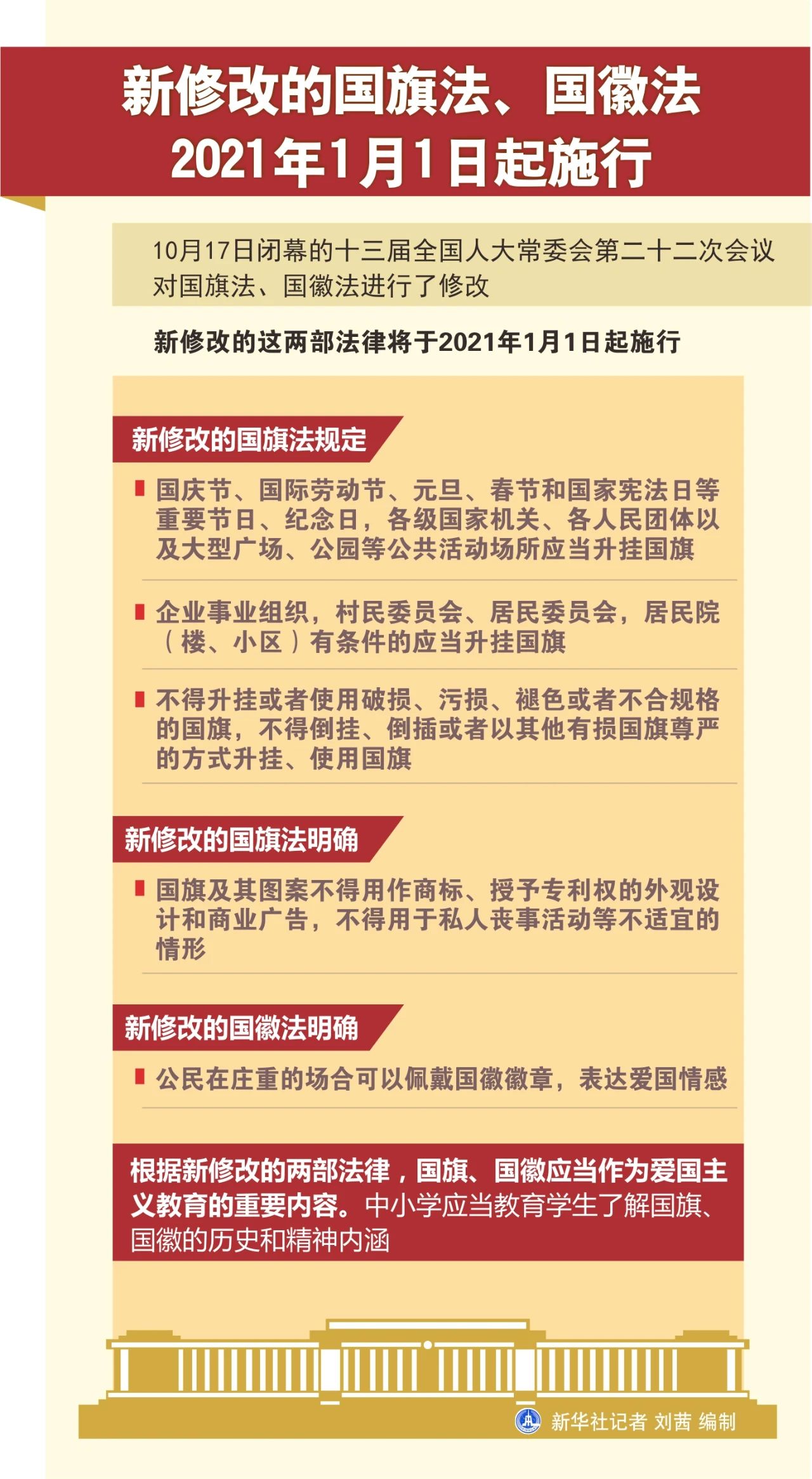 3、17日闭幕的十三届全国人大常委会第二十二次会议对国旗法、国徽法进行了修改。新修改的这两部法律将于2021年1月1日起施行。