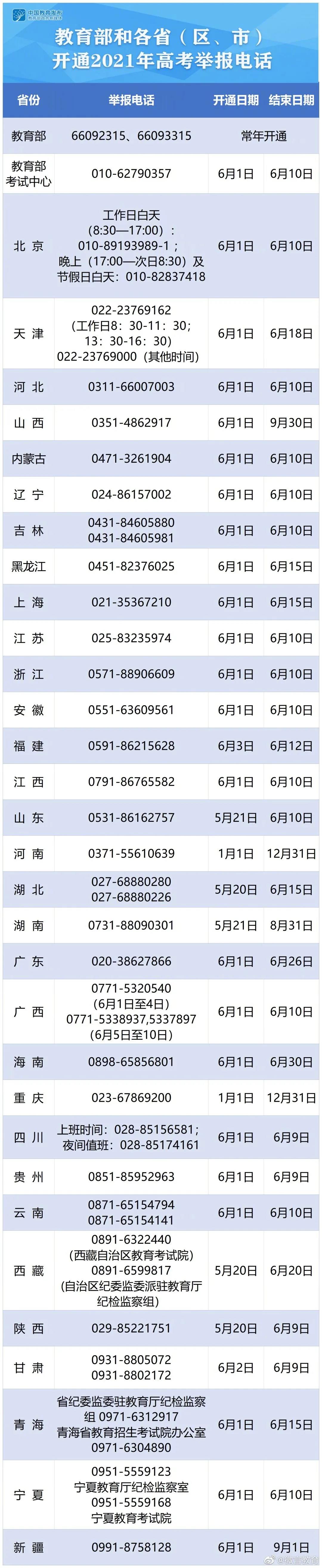 4.日前,教育部以及全国各省(区、市)教育行政部门和招生考试机构开通2021年高考举报电话。