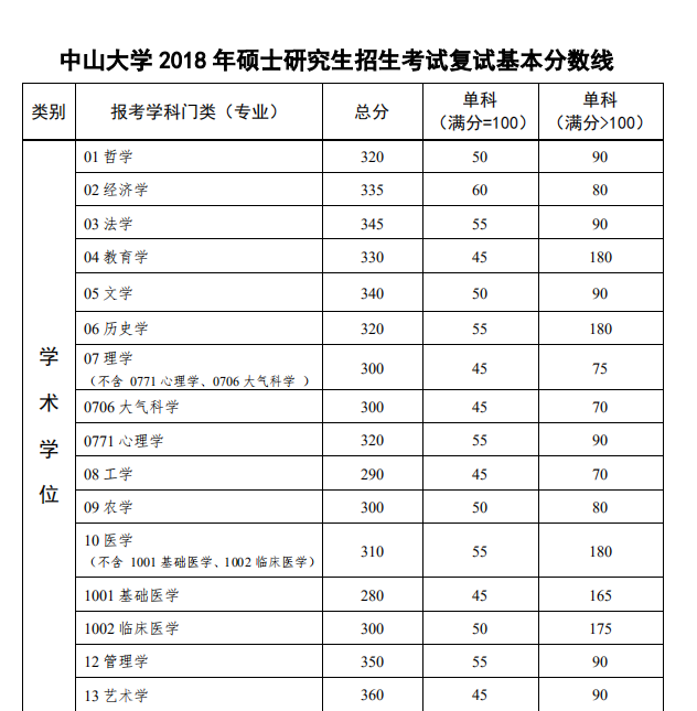 | 类别 | 报考学科门类(专业) | 总分 | 单科 (满分=100) | 单科 (满分>100) |