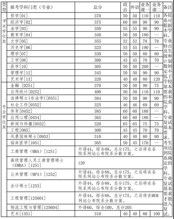 (2)“少数民族高层次骨干人才计划”(不含新疆MPA项目):同时满足满分100分科目单科成绩不低于40分;满分150分科目单科成绩不低于70分;满分200分科目单科成绩不低于107分;满分300分科目单科成绩不低于140分;总分满分300分考生总分不低于195分;总分满分500分考生中,理工医考生(报考专业代码前两位为“07”、“08”或“10”)要求总分不低于270分,非理工医考生总分不低于320分。或者依据所报考院系(专业)复试分数线,总分线降10分,单科线不降。两项分数政策不可同时享受。