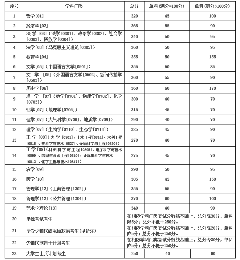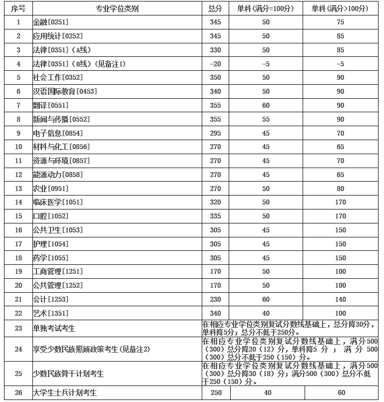备注:1.B线适用范围:第一志愿报考我校法律(法学)、法律(非法学)专业,且本科毕业4年(同等学力考生毕业6年)及以上(毕业信息以网报信息为准)的考生。满足B线要求的考生须向报考学院书面申请并经报考学院审核同意后方可参加复试。2.享受少数民族照顾政策的考生是指:报考我校、申请定向国务院公布的民族自治地方就业且户籍在以上地区的少数民族考生。