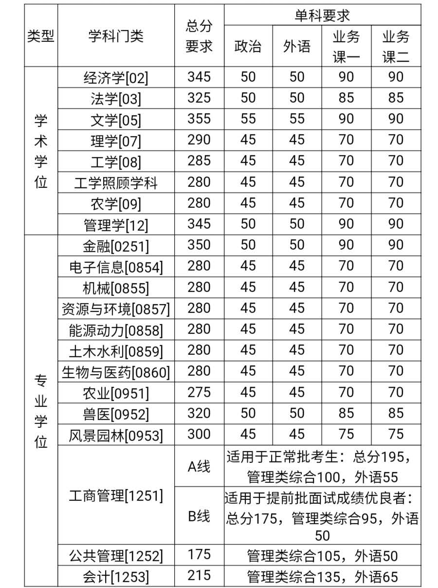 说明:上表为我校基本复试分数要求,生源充裕学院可根据整体考试情况、招生计划、学科专业特点等,上调分数要求,但差额复试比例一般不得低于120%。报考该类学院的考生须达到学院公布的复试分数要求才能参加复试。