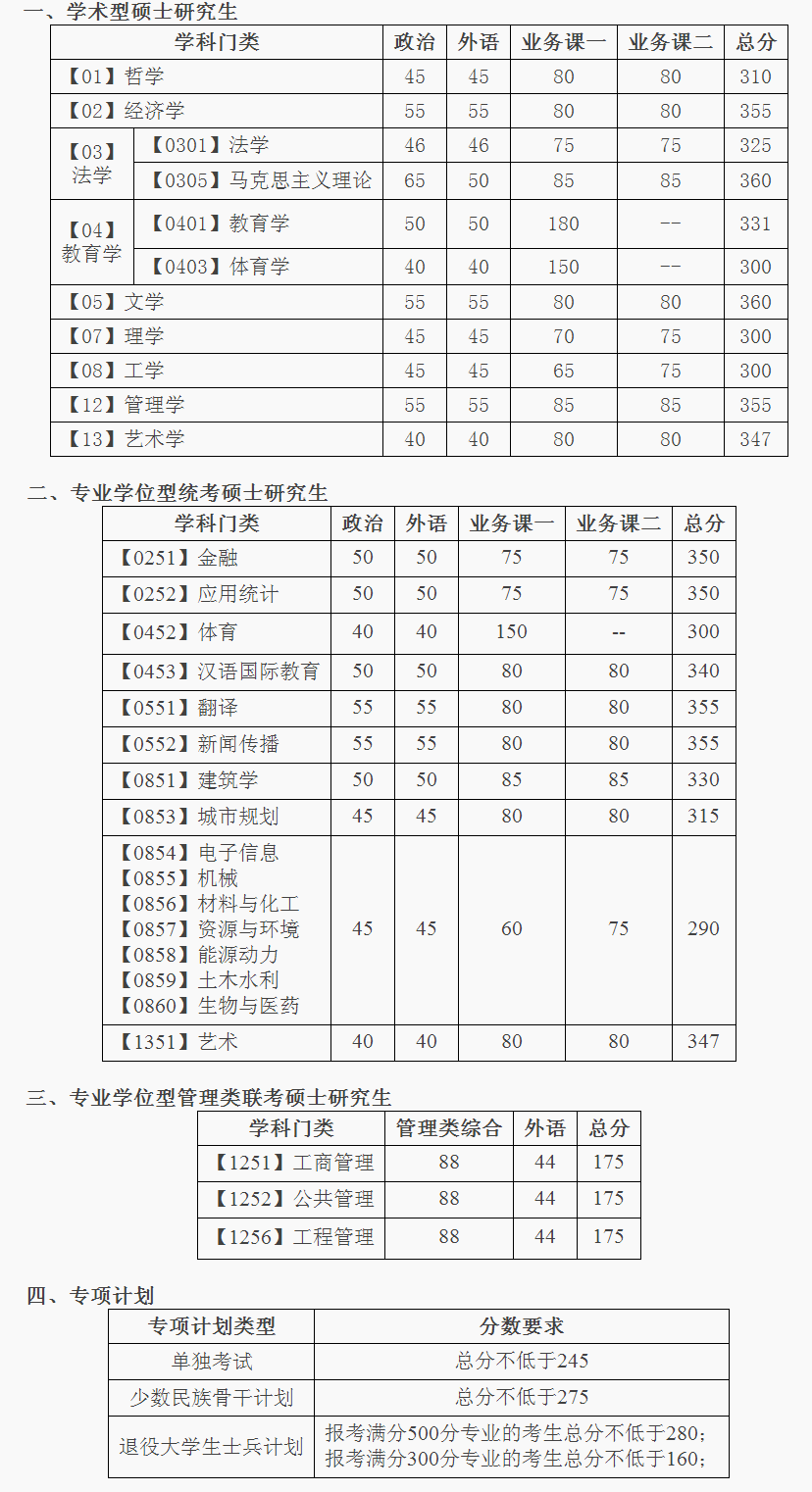 根据教育部相关文件精神,结合我校实际情况,经学校招生工作领导小组讨论研究决定,我校2020年全国硕士研究生招生考试考生进入复试的初试成绩基本要求如下:
