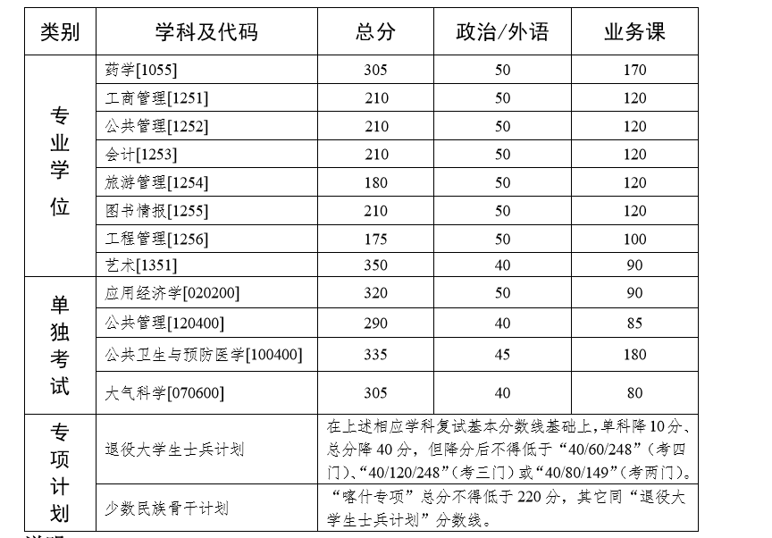1. 以上为我校复试基本分数线。各招生单位在学校复试基本分数线之 上,可结合生源和招生计划等情况,自主确定本单位考生进入复试的初试 成绩要求及其他学术要求。相关复试工作安排另行通知。