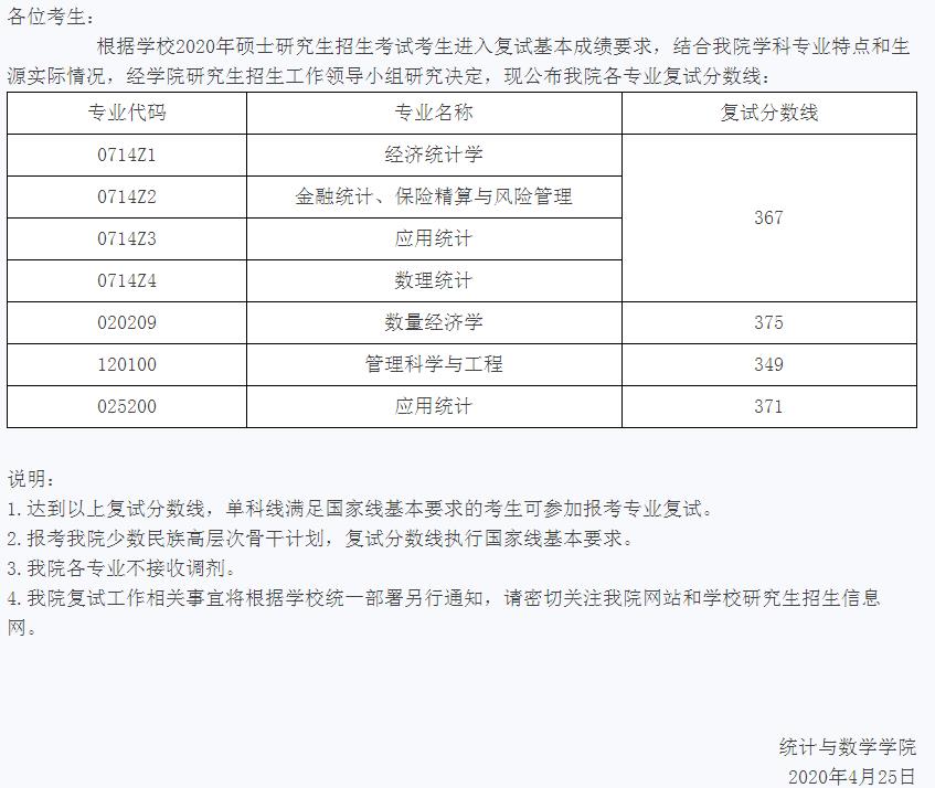2020拼搏在线官网分数线:中南财经政法拼搏(中国)统计与数学学院关于公布2020年硕士研究生招生考试复试分数线的通知
