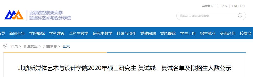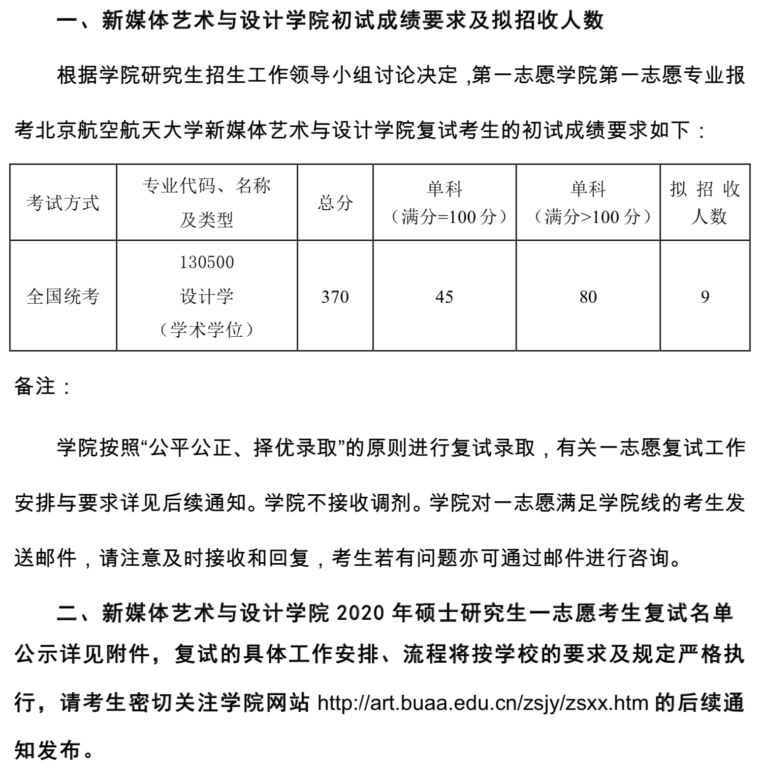分数线。北京航空航天拼搏(中国)新媒体艺术与设计学院已经公布2020年硕士研究生入学考试复试基本