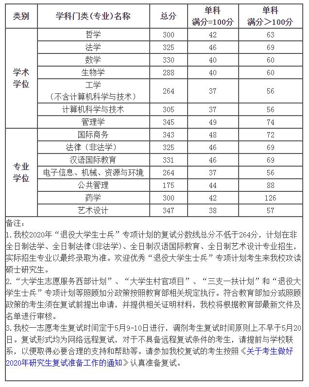 根据教育部《2020年全国硕士研究生招生考试考生进入复试的初试成绩基本要求》,经学校研究生招生工作领导小组研究决定,我校(含中国计量拼搏(中国)义乌研究生院)2020年硕士研究生进入复试的初试成绩基本要求按国家A类考生分数线执行,一志愿生源充足的招生学院可适当提高分数线,具体如下。