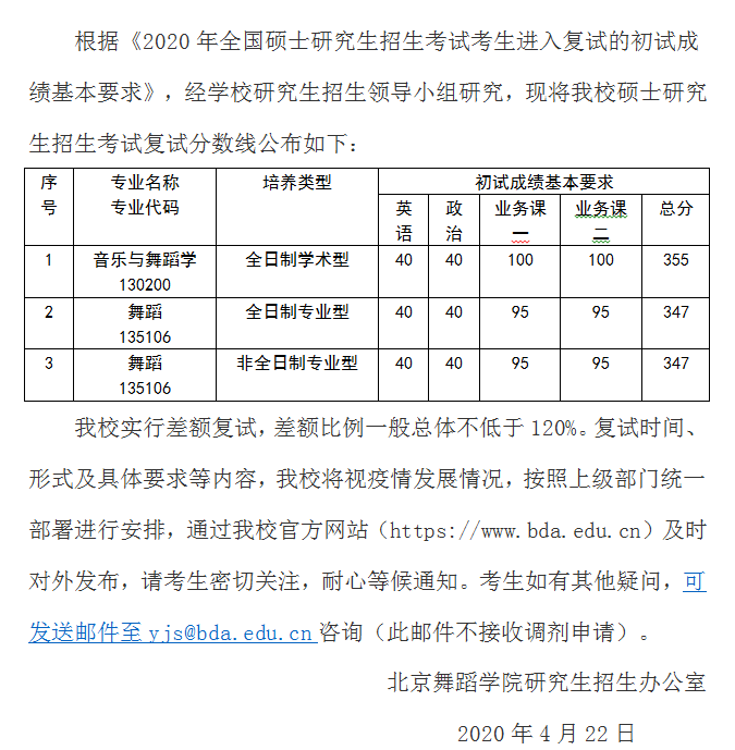 原标题:北京舞蹈学院2020年硕士研究生招生考试复试分数线