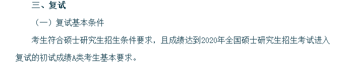 考生符合硕士研究生招生条件要求,且成绩达到2020年全国硕士研究生招生考试进入复试的初试成绩A类考生基本要求。