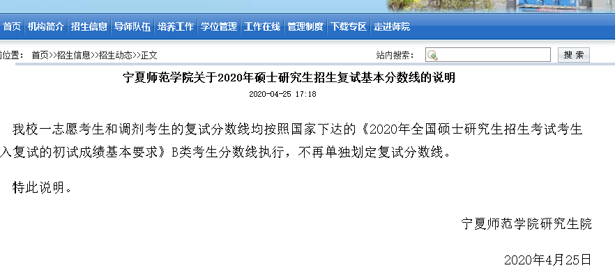 原标题:宁夏师范学院关于2020年硕士研究生招生复试基本分数线的说明