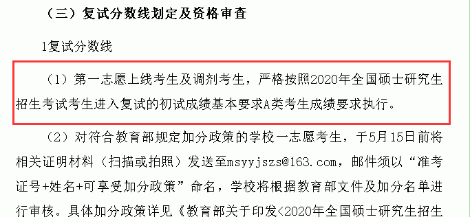 (2)对符合教育部规定加分政策的学校一志愿考生,于5月15日前将相关证明材料(扫描或拍照)发送至msyyjszs@163.com,邮件须以“准考证号+姓名+可享受加分政策”命名,学校将根据教育部文件及加分名单进行审核。具体加分政策详见《教育部关于印发<2020年全国硕士研究生招生工作管理规定>的通知》。(申请调剂考生可在提交调剂申请前发送以上材料)。