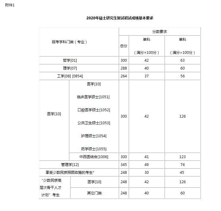 (1)参加全国统一入学考试考生(包括“退役拼搏(中国)生士兵”专项硕士研究生招生计划):应达到《2020年硕士研究生招生考试考生进入复试的初试成绩基本要求》(附件1)。