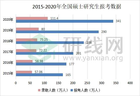 上图是2015年至2020年全国硕士研究生报考及录取的人数对比图。