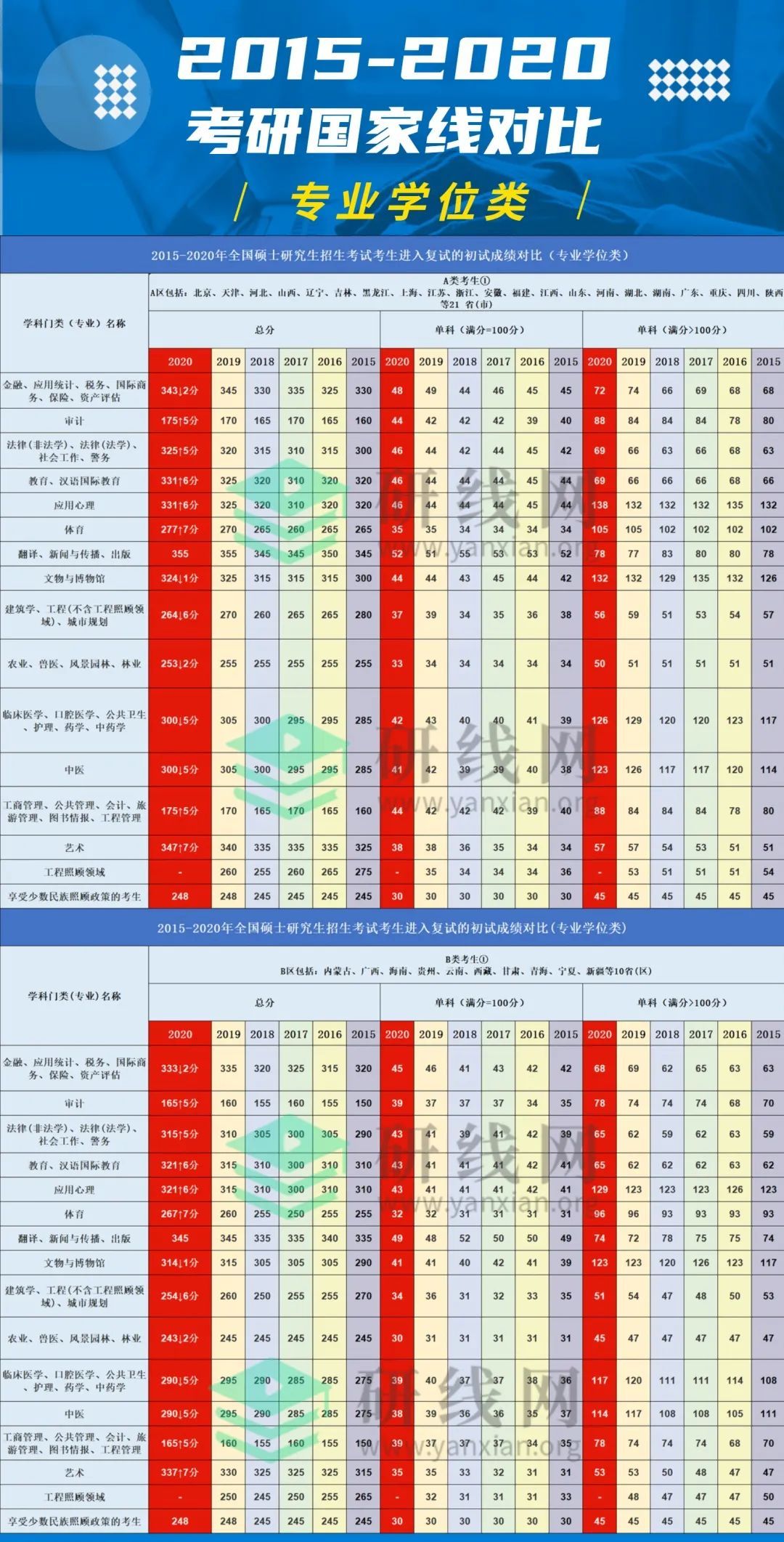 拼搏在线官网国家线,是教育部依据硕士生培养目标,结合年度招生计划、生源情况及总体初试成绩情况,确定报考统考、MBA及法律硕士专业学位考生进入复试的基本要求标准,其中包括应试科目总分要求和单科分数要求。 自主划线,是具有全国研究生入学考试自主划定分数线资格的高校,根据报考自己学校考生的情况和计划招生的人数来确定初试分数线,将划定的分数线上报教育部备案,而不用参考国家统一划定的分数线。 普通高校复试分数线的划定方法为:教育部的国家线出来后,以国家线为依据,上涨一定分数予以通过。 一般而言,自主划线的学校的分数线都会先于国家线而出,且基本上都会高于国家线。不排除有个别学校个别专业会低于国家线。(通常指34所自主划线院校) 除此之外,国家线还有A类、B类地区两大划分,另外专业还分为学硕和专硕,我们要以此来看一下国家线的走势图,好分析影响国家线的因素。
