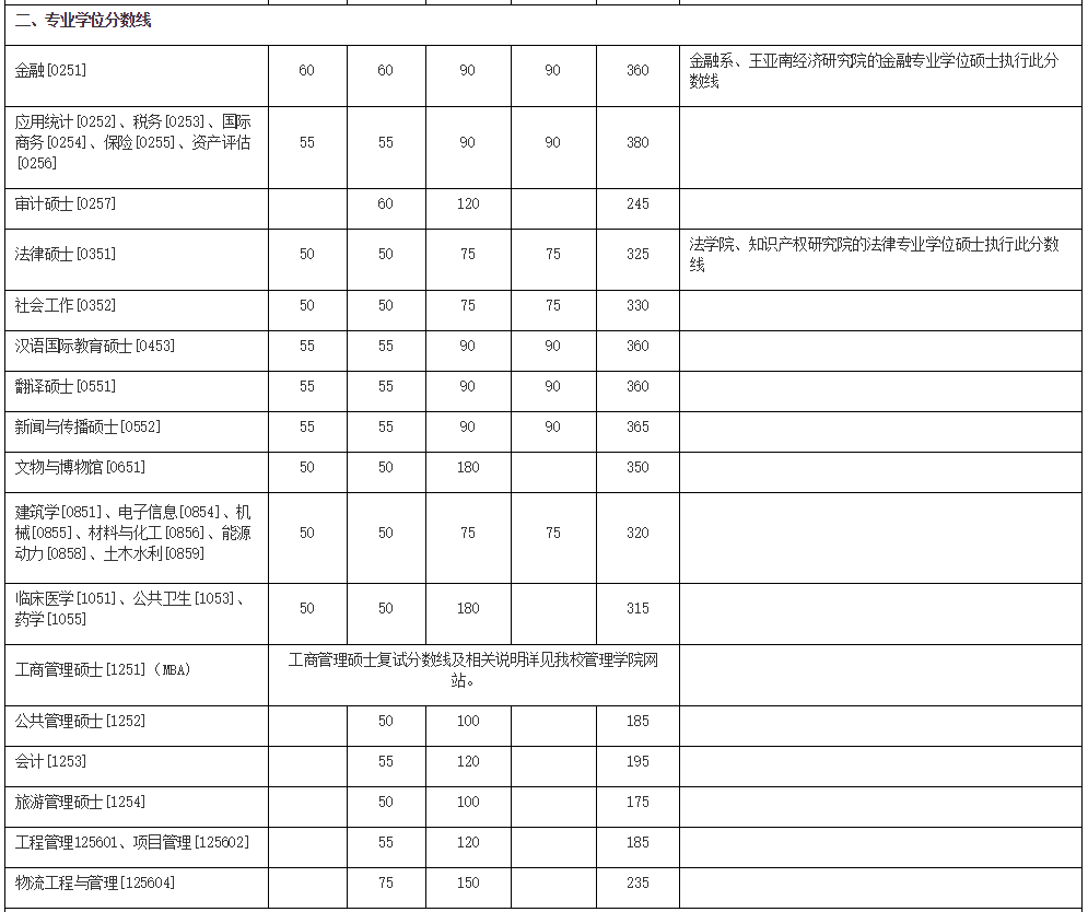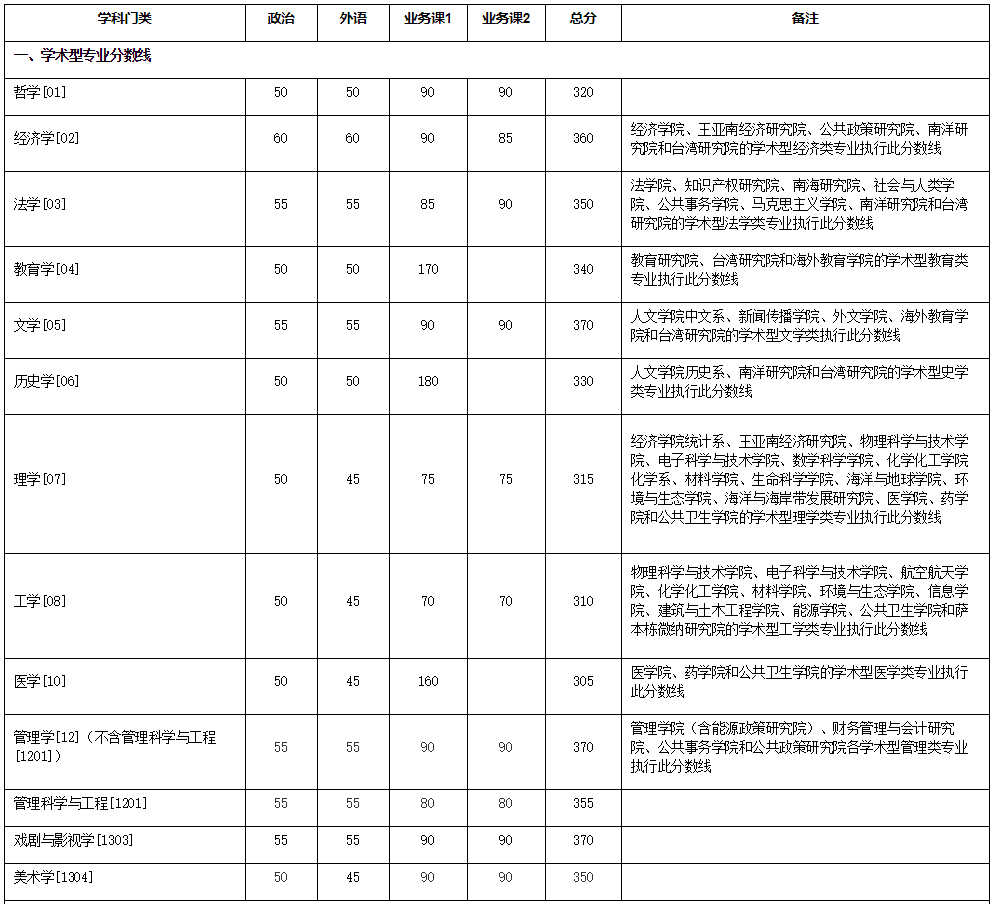 1.以上分数线为考生进入我校复试的初试成绩基本要求,各学院(研究院)可在不低于学校复试基本要求的基础上,根据生源和计划情况确定本学院(研究院)各专业考生进入复试的初试成绩要求。