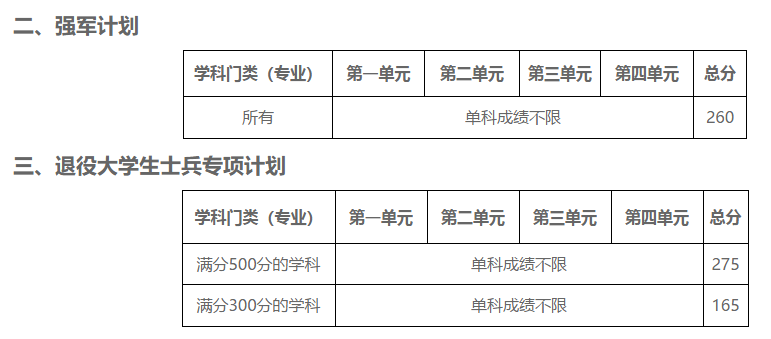 单科成绩不限,总分不低于对应统考的学科门类(专业)学校分数线的90%(四舍五入取整)。