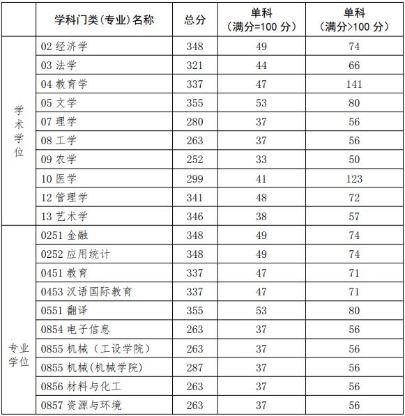 表 1 各学科(专业类别)考生初试成绩上线要求