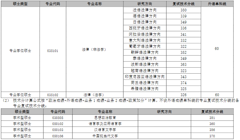 复试分数线我校复试分数线制定办法:在国家教育部分数线(见教育部网站)基础上以技术分计。(1)技术分计算公式按“政治成绩+外语成绩+业务1成绩+业务2成绩+政策加分”计算,且设外语成绩单科线的专业复试技术分线的各专业复试技术分线: