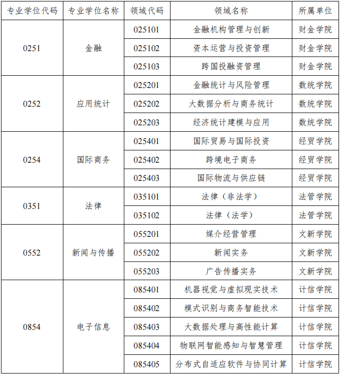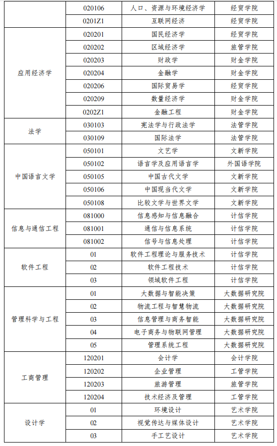 2、接受调剂的学科专业:理论经济学、应用经济学(除产业经济学外)、法学(除民商法、刑法学外)、中国语言文学、信息与通信工程、软件工程、管理科学与工程、工商管理、设计学学术硕士,金融、应用统计、国际商务、法律、新闻与传播、电子信息专业硕士初试成绩达到教育部公布的2021年研究生复试基本分数线(A类考生)要求。
