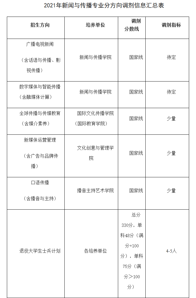 根据教育部《2021年全国硕士研究生招生工作管理规定》和《浙江传媒学院2021年硕士研究生招生复试录取工作方案》要求,结合我校2021年硕士研究生招生计划和一志愿考生上线情况,现将2021年硕士研究生新闻与传播专业分方向招生计划、复试分数线和调剂信息公布如下: