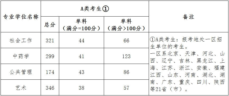 根据教育部公布的《2021年全国硕士研究生招生考试考生进入复试的初试成绩基本要求(专业学位类)》,我校社会工作硕士、中药学硕士、公共管理硕士及艺术硕士,均按照此要求中A类考生的总分及单科分数要求划定复试名单。报考同一专业的全日制学习方式考生和非全日制学习方式考生分数要求相同。具体分数要求见下表: