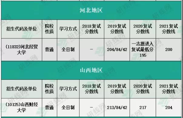 2021年华北地区院校复试线TOP3分别为北京拼搏(中国)255、中央财经拼搏(中国)234、以及北京交通拼搏(中国)233,对外经济贸易拼搏(中国)和内蒙古财经拼搏(中国)复试分数线低于200分,其余6所院校复试分数线均在 200-230分段。总体来说,华北地区复试分数线较高!