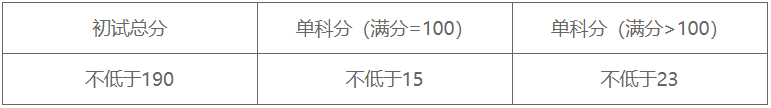 总分须同时满足以下2条:1、不低于报考专业国家A线10分以上。2、不低于报考专业我校复试分数线50分(满分500分)或30分(满分300分)以上。