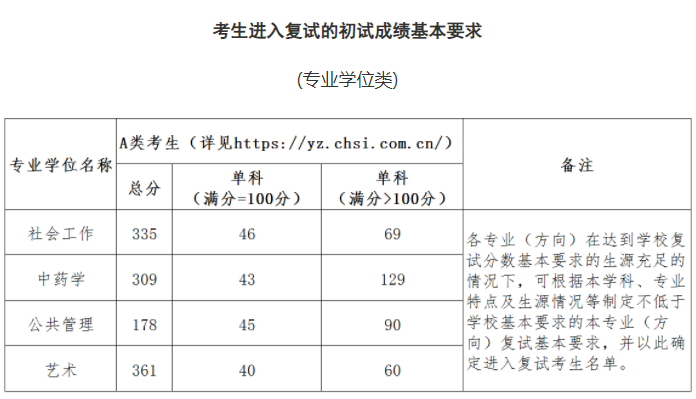 根据教育部公布的《2022年全国硕士研究生招生考试考生进入复试的初试成绩基本要求(专业学位类)》,我校社会工作硕士、中药学硕士、公共管理硕士及艺术硕士,均以此要求中A类考生的总分及单科分数要求为基准来确定考生进入我校复试的基本分数要求及复试名单。报考同一专业的全日制学习方式考生和非全日制学习方式考生分数要求相同。考生进入我校复试基本分数要求见下表: