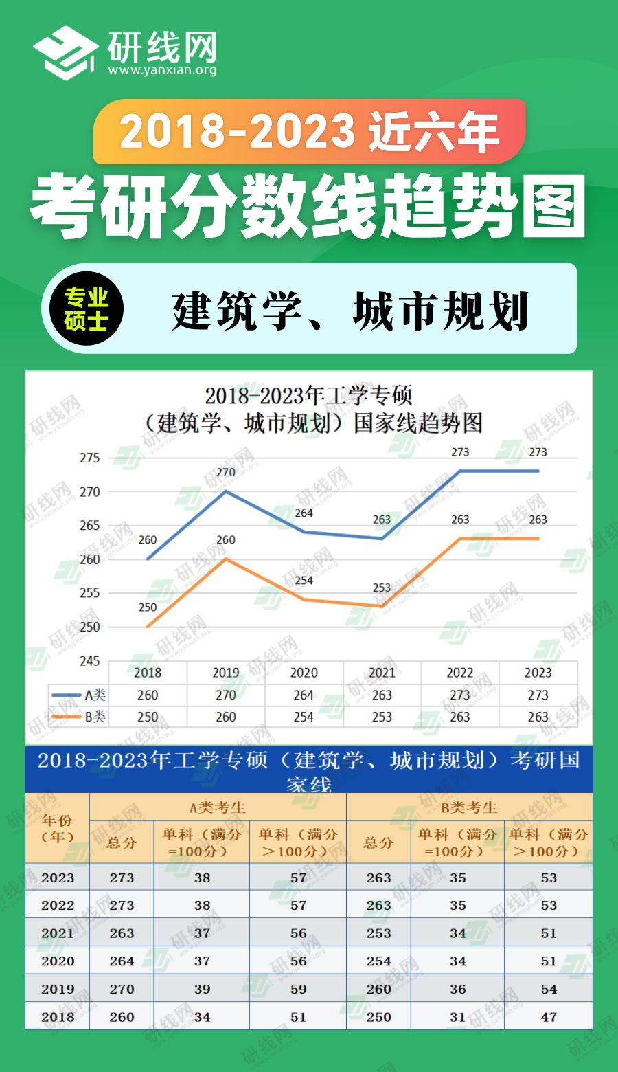 2023拼搏在线官网分数线:2018-2023年工学专硕(建筑学、城市规划)近六年拼搏在线官网分数线趋势图