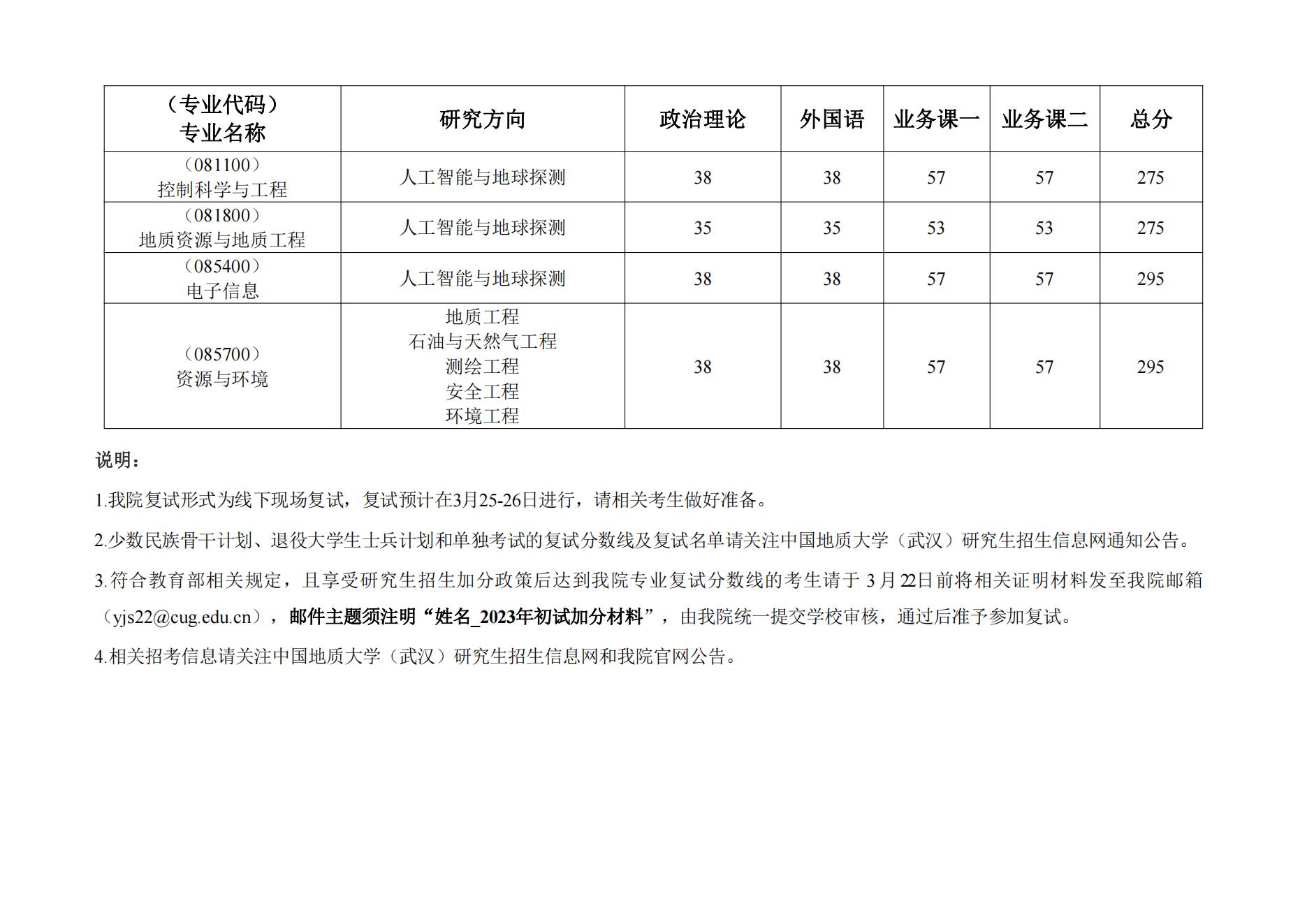 2023拼搏在线官网分数线:中国地质拼搏(中国)(武汉)未来技术学院2023年硕士研究生招生考试复试基本分数线及相关说明