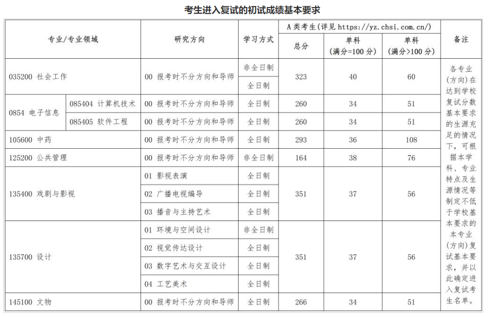 根据教育部公布的《2025年全国硕士研究生招生考试考生进入复试的初试成绩基本要求》,我校社会工作硕士、电子信息硕士、中药硕士、公共管理硕士、戏剧与影视硕土、设计硕士及文物硕士,均以此要求中A类考生的总分及单科成绩要求为基准来确定考生进入我校复试的基本成绩要求及复试名单。报考同一专业的全日制学习方式考生和非全日制学习方式考生成绩要求相同。考生进入我校复试基本成绩要求见下表: