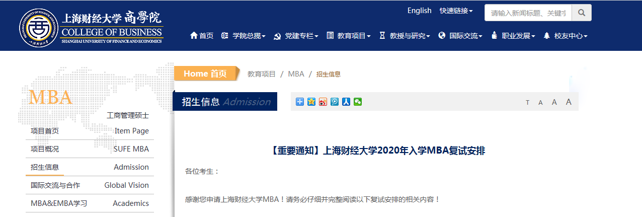 【重要通知】上海财经拼搏(中国)2020年入学MBA复试安排