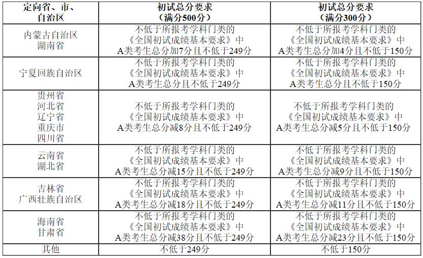 单科成绩要求不低于所报考学科门类的《全国初试成绩要求》中B类考生成绩要求。满分500分的考生初试总分不低于所报考学科门类的《全国初试成绩要求》中B类考生总分减11分;满分300分的考生初试总分不低于所报考学科门类的《全国初试成绩要求》中B类考生总分减7分。