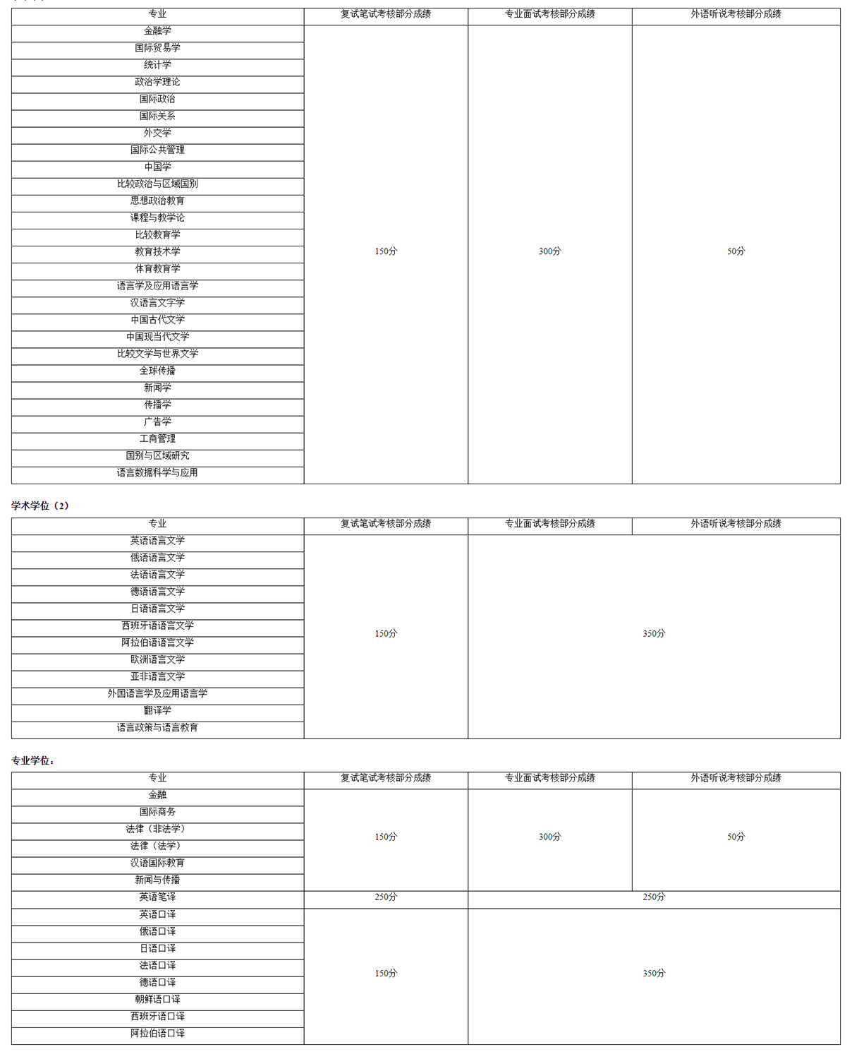 复试满分为500分,各专业分值比例如下(复试笔试、专业面试、外语听说考试成绩均按百分制给分,在计算复试总成绩的时候将进行自动折算):