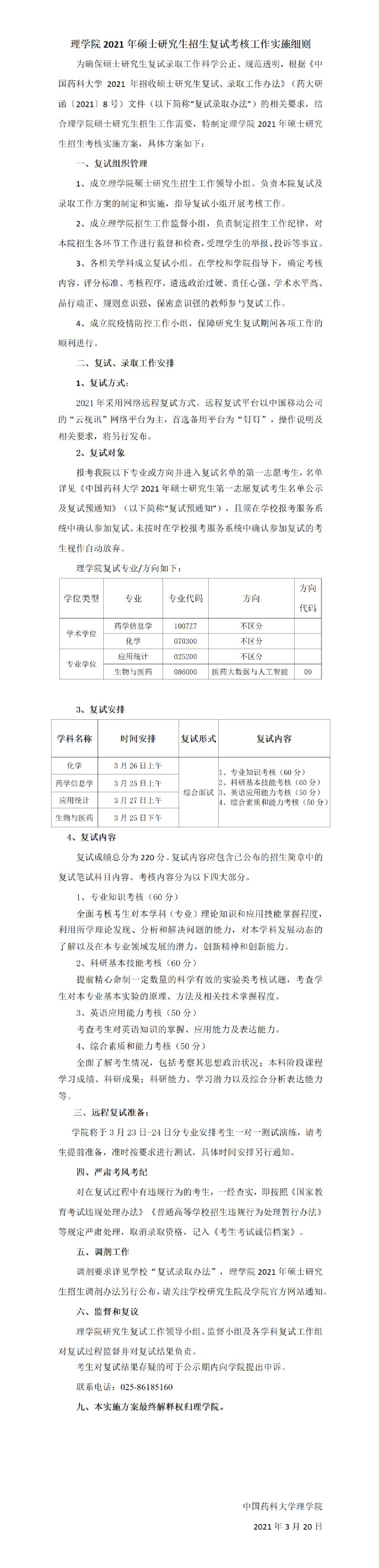 以上就是“2021拼搏在线官网复试安排_复试时间_复试方式:中国药科拼搏(中国)理学院2021年硕士研究生招生复试考核工作实施细则”的的全部内容。其他院校的2021复试录取安排可戳→【2021拼搏在线官网复试:各院校复试时间_复式方式_复试考试内容汇总!】