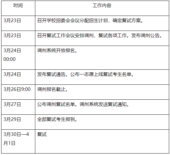 (3)调剂报名截止后,各学位点参考调剂考生提交资料、初试成绩、本科毕业专业及学位点和导师组提出的其他要求完成调剂复试考生的筛选,并将调剂复试考生名单报学校招生办公室,由学校招生办公室向考生发送复试通知;