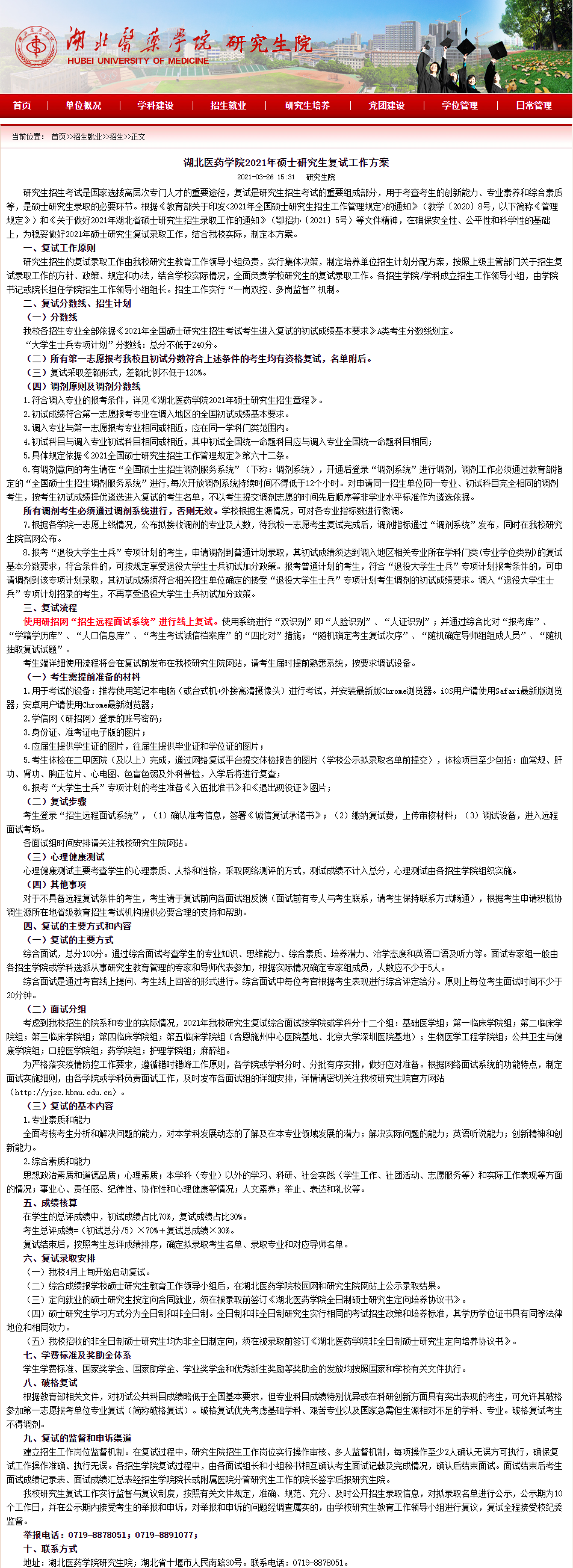 2021拼搏在线官网复试安排_复试时间_复试方式:湖北医药学院2021年硕士研究生复试工作方案