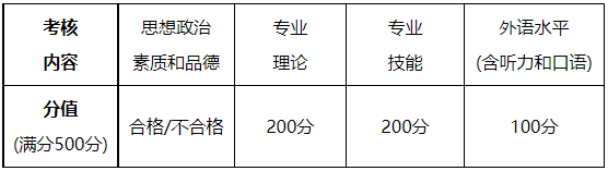 复试小组应集体研究、设置题目、形成题库,需保证复试考生一人一题、随机抽选。试题中需包含专业理论、专业技能和外语水平等相关考核内容。具体内容由各复试小组在保证公平性、科学性基础上,依据专业特点和实际情况制定,复试考核内容分值如下表所示: