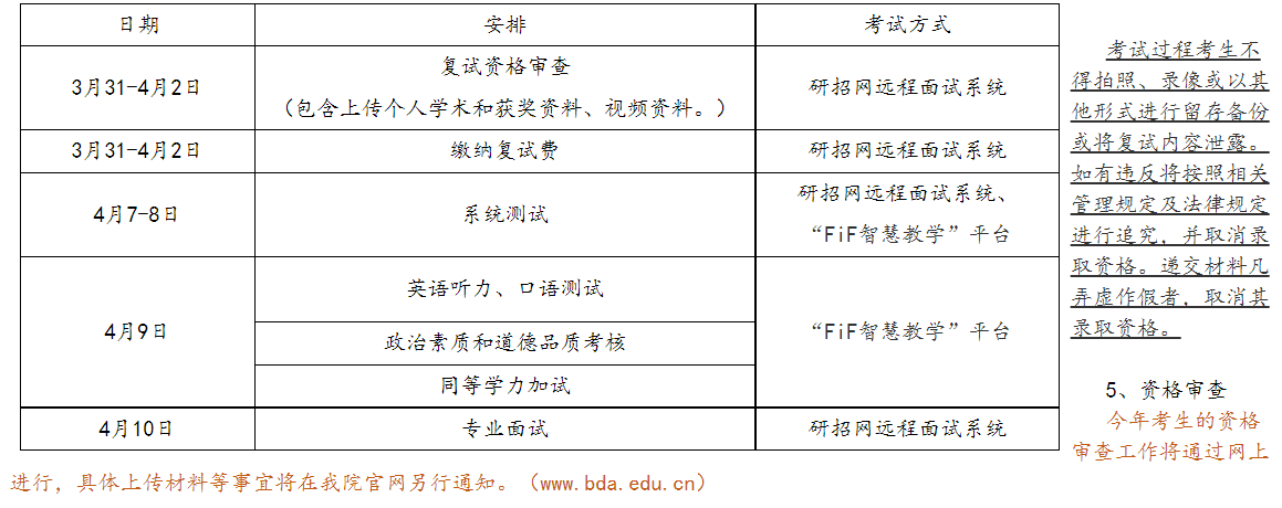 我院复试时间拟定于2022年4月9、10日进行。各项考试的详细时间和具体要求将在我院官网及时公布。(www.bda.edu.cn)